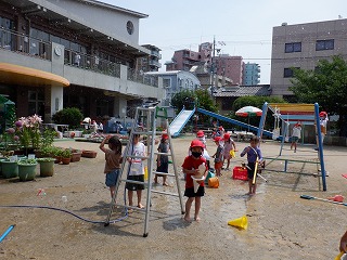先生や友達と一緒にビシャビシャになって,暑い今日にはぴったりの遊びでした。