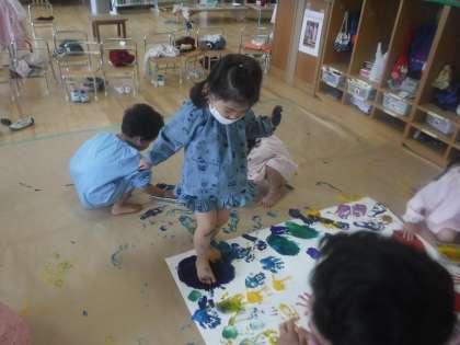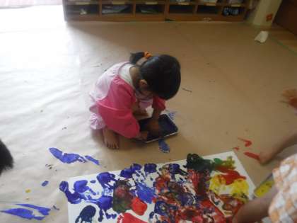 バットの絵の具をみて,手に付けて眺めたり,紙の上で両手を動かし感触を楽しんだりしていました。また,いろいろな色を次から次へと手に付けて,色が変わっていくことや,絵の具を足につけて歩いているうちに,足の裏の色が違うことに驚き,先生と一緒に笑い合いました。