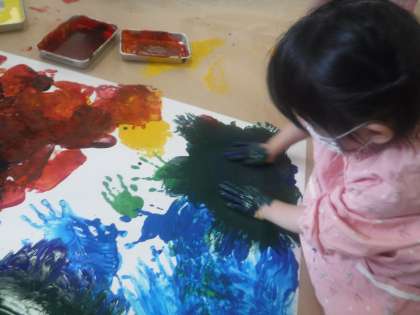ヌルヌルの感触を試しながら色の変化も喜んでいました。じっくり一人で楽しむ姿や先生に見せて喜ぶ姿,先生の手のひらと合わせて先生と一緒に楽しむ姿が,「自分と同じだ」と感じ,安心して絵の具遊びができたようです。