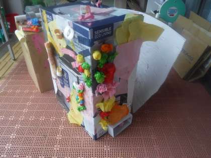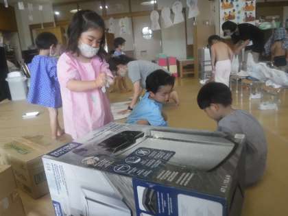 だんだん手と手が引っ付いてきたり,パリパリしてきたりしてくること感じ,先生に新たな発見を伝えに来ました。引っ付くならつけてみよう!と出したものを段ボールに貼りつけて喜んだり,お花紙を糊に練りこんだりして,「梅干しみたい」「ダンゴムシみたい」と見せてくれました。友達がつけたものをみて,「こんなのついてる」と気づく姿もありました。