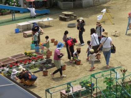 帰る前に,以前種まきをした「ふうせんかずら」を,親子で植木鉢に植え替えました。これからどんどん大きくなっていきますよ。幼稚園に来た時のお楽しみ!うさぎ組のない日は,幼稚園の子どもたちが水やりをして大事に育てておきますね。