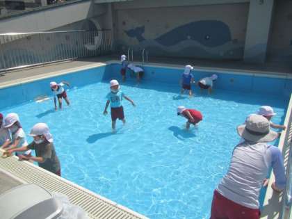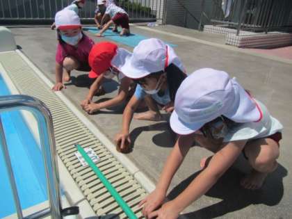 5歳児ゆり組の子どもがプールを掃除しました。