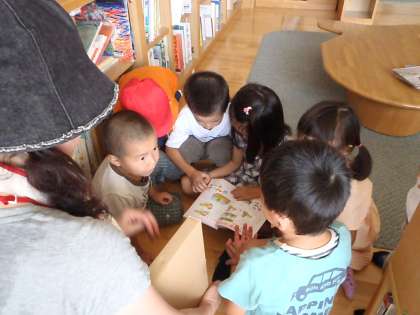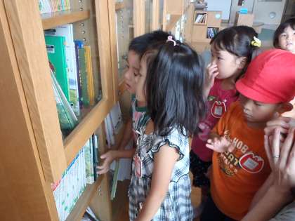 どうやら,ザリガニをたんぽぽ組からもらってお部屋で飼うことになったようで「ザリガニは何を食べるのかなぁ」ということを「以前に絵本の部屋で見たことがある」という子どもたちから声が上がり,早速に探しにきたとの事でした。