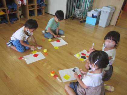 5色紙ではグループで1枚の色紙を四分の一ずつして分け合いました。