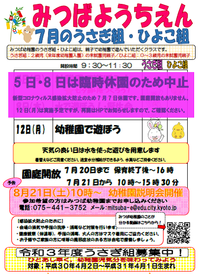 新型コロナウィルス感染拡大防止のため,本園は6月28日から7月7日まで臨時休園いたします。誠に残念ですが,上記のように7月5日(月)8日(木)の教育相談は中止します。再開が決定しましたら,またこのHPにてお知らせいたします。