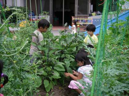 カレーパーティーの準備その1 園庭の夏野菜の収穫をしました