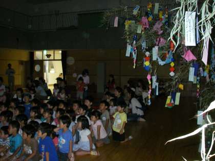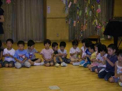 七夕のつどいに遊戯室に集まりました。たんぽぽ組,もも組,ばら組,ゆり組それぞれが親子で作って飾った大笹がゆれる中,みんなで「たなばたの話」のパネルシアターをみました。「たなばたさま」の歌を歌った後,こんぺいとうを食べました。