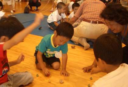 後半は遊戯室に移動して,全学年のおじいちゃん・おばあちゃんと一緒に昔遊びを楽しみました。
