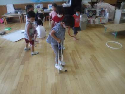 今日もAちゃんは「カブトムシ出してほしい」と言いに来て,カブトムシの様子を見ていました。(触るのは怖いけど,先生が持ってくれるなら見られる)そんな気持ちが感じられました。やがて先日と同じようにカブトムシは粘土板の上を簡単に乗り越えて,歩いていきました。竹ポッコリに乗っていたBちゃんはそれに気づいて,カブトムシを踏まないように,まるでカブトムシを守ってあげているように一緒に歩いていました。