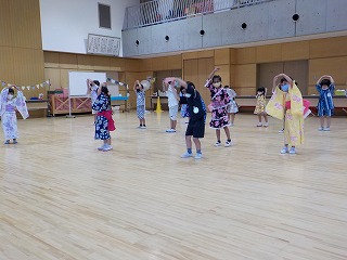 いつもは幼稚園にはいない時間に幼稚園に来るだけでワクワクした様子の子どもたち。遊戯室で『はなまる温泉』を踊ったり,年中組の先生たちが考えた○×ゲームやお誕生月仲間を踊ったりしました。