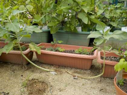 プランターと植木鉢の間から,ニョキッと伸びたひまわり。種まきをした時に種がこぼれたのか,地面から伸びています。