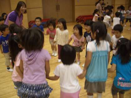 「あくしゅをしよう」では,3歳児も4歳児も5歳児も交じり合い,一緒に握手をしたり手拍子をしたりして遊びました。