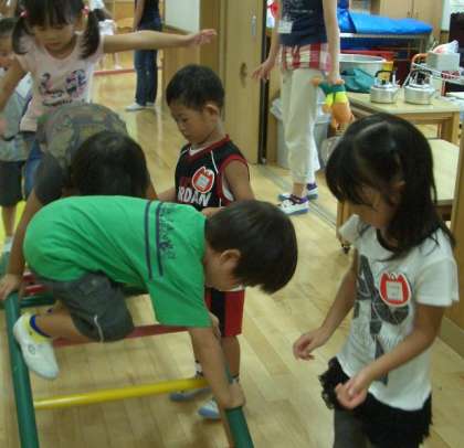 4歳児の子どもたちが,3歳児の子どもの手を持ってあげたり,こうしたらうまくいけるよとアドバイスしています。