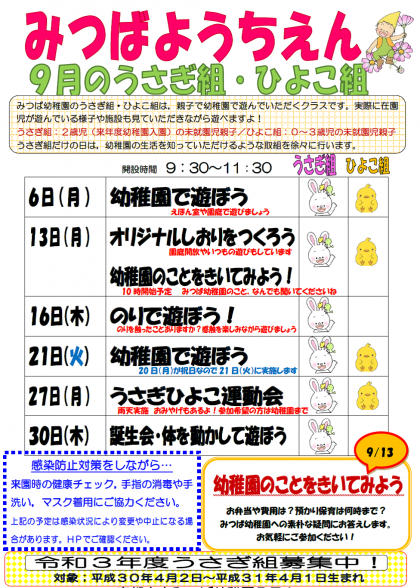 9月の教育相談(うさぎ組・ひよこ組)予定です。