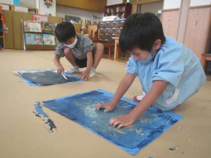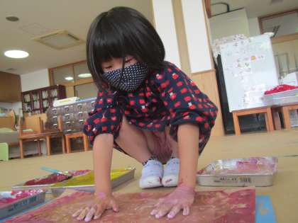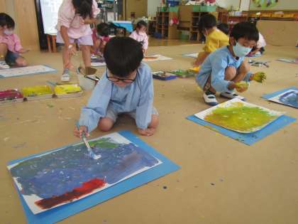 年長ゆり組は久しぶりに絵の具遊びをしました。