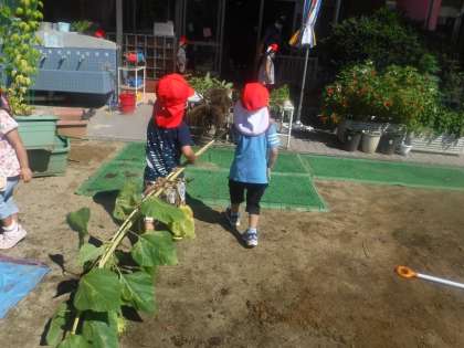 4歳児が一生懸命している姿をみて,3歳児も頑張って土を運んだり,根っこが絡み合っている土をほぐしたりしました。