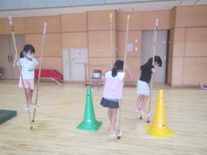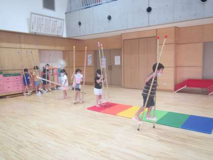 いろいろな姿がありました。今まで歩数をたくさん乗れるようになっていた子も,高い高い竹馬にしていた子も,「あれ?今までみたいに簡単にはいけないぞ」という感じでした。