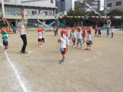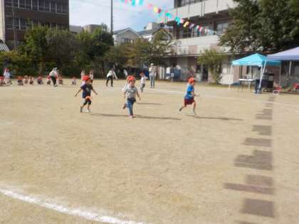4歳児や5歳児の大きい組の子どもたちがその様子を見て応援し,運動会気分が少し盛り上がってきています。