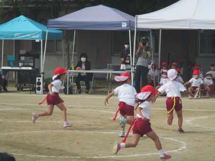 負けた赤チームのAくんやBちゃんが泣いていました。その時そっと近くに来た白チームのCくん。「負けちゃったし泣いてるの?」と声をかけています。先生が「悔しい涙が出ているんだよね」と言うと「また幼稚園始まった時やろな。またリレーしような」と言ってくれました。負けて悔しい気持も経験しているからこそ,の言葉だと思いました。