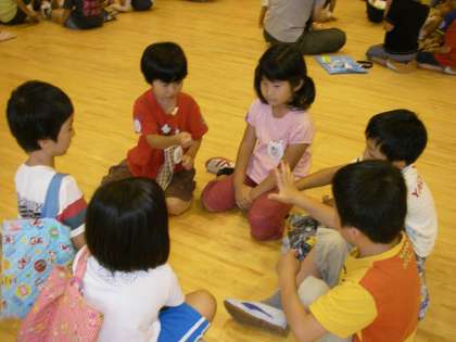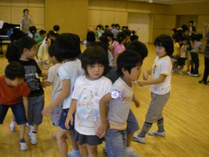 最後に,また遊戯室にみんな集まって「あたまであくしゅ」や「なべなべ」をして遊び楽しい時間を過ごしました。同じグループの仲間と仲良くなれたかな?