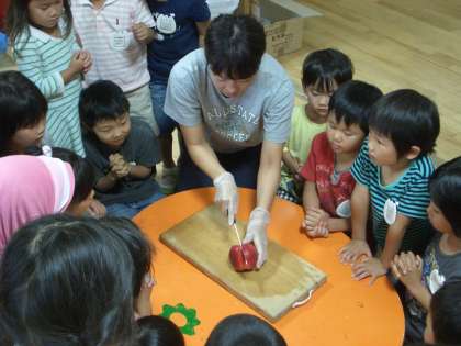 先生がまな板と包丁を持ってきて,桃太郎のお話のようにぱかっと割ってみる予定だったのですが,う〜ん割れません。