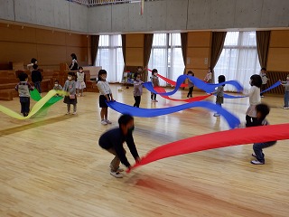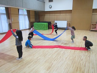 「波みたい!」と,2人で揺らしたり,ボールをのせて落ちないように転がしてみたり。「ゆり組さんがしてたみたいに!」と曲に合わせて,動く姿も多くみられました。運動会での,かっこいいゆり組の姿は,憧れとなって,子どもたちの心に濃く残っているのだな,と感じました。