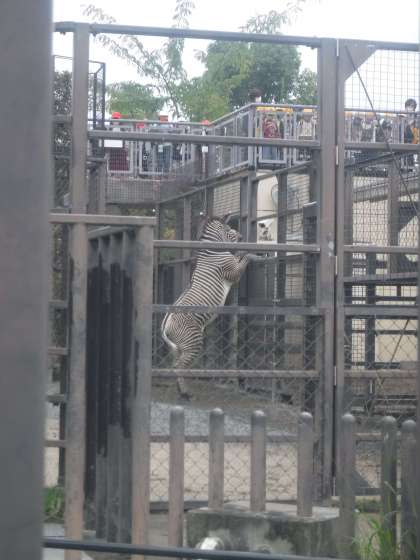 フラミンゴの前ではフラミンゴのまねをして,またまたシマウマの前に。するとそこでシマウマのけんかに出くわしました。大きな声で二頭が言い合っていました。あまりの迫力にみんな『あぜん!』最後には立ち上がって頭を隣の柵の中に入れて怒っていました。