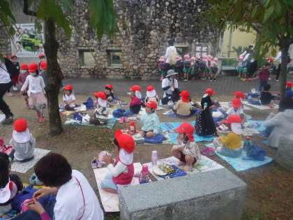 いよいよおにぎりお弁当です。「おなかすいた〜」と言って準備をしました。「おいしい」「たのしいな」そんな声が聞こえてきて,嬉しくなりました。お弁当の後のおやつも大喜びで食べていました。