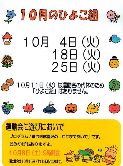 8日(土)に運動会を行う関係で,11日火曜日は幼稚園が代休になりますので,ひよこ組もお休みです。8日が雨天の場合は,15日に運動会を行いますので,よろしくお願いします。