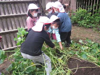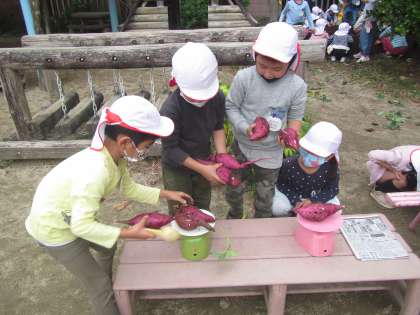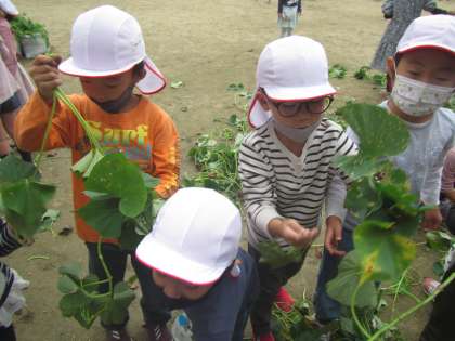 おいものツルも食べられるということを伝え,遊ぶ前にみんなでツルも収穫しました。ほんの少しではありますが,みんなで食べられたらいいなと思っています。