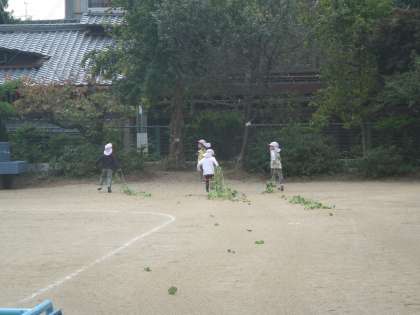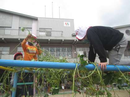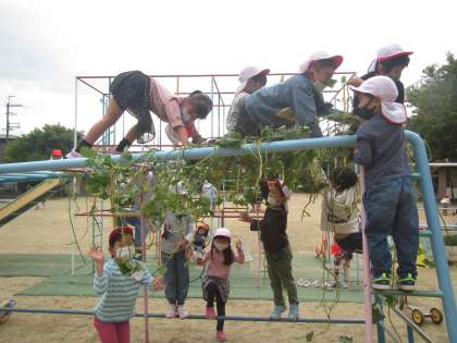 食べられる部分を収穫した後,長いツルで遊び始めた子どもたち。