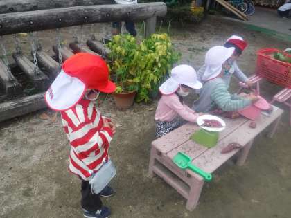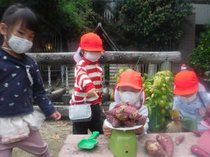 今日は年長児と年中児がさつまいもを掘ってくれました。そのいもを年長児がはかりで測っているのを横で見ていたAちゃん。「こっちのほうが重いで」「じゃあこれは?」年長児が話をしているのをじっと聞いていました。年長児がいなくなると,同じようにやってみたくなりました。いもをのせると,針が動きます。「○○ってなってる」「じゃあこれは?」いろいろ試したくなりました。「さっきとちがうね」「なんでだろうね」と言いながらはかりを見ていると,「何しているの?」と,どんどん友達が集まってきました。いもをたくさん乗せると,針の数字が大きくなります。「もっとのせてみよう」「こっちのほうが重いよ」年長児が言っていた『重さ』にも気が付きました。年長児からたくさん刺激を受けて楽しんでいます。