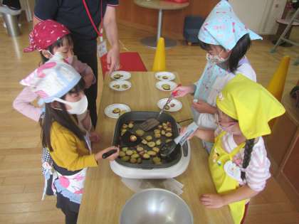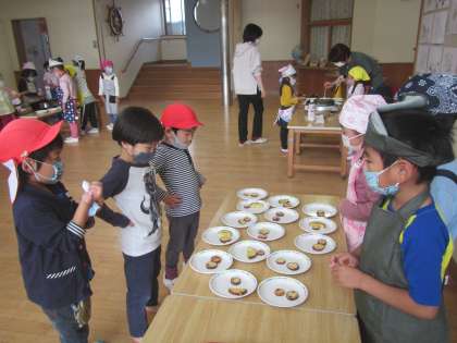 焚火をして焼くことはできませんが,年長児がホットプレートを使って焼きました。