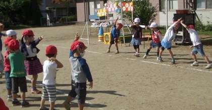 3歳児では,自分が運動会に出るだけでも精一杯なのに,4歳児では,自分の力をいっぱいに出し切り,友達と一緒にする楽しさを感じています。
