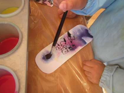 「見て!こうやって押さえたら色が広がってくるよ(絵の具がにじんでいく様子)」