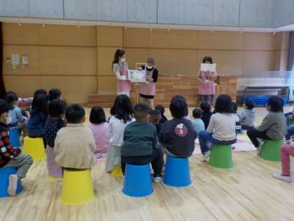 ている年長児,「おもしろい!」「短かった(あっという間だった)」と話の面白さや,その場の心地良い雰囲気を味わっていた年中児,年少児・・・温かい読み聞かせを通して,絵本の世界を楽しみ,心を揺らす,素敵なひと時を過ごさせていただきました。グレースライオンズクラブの皆様,ありがとうございました!