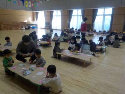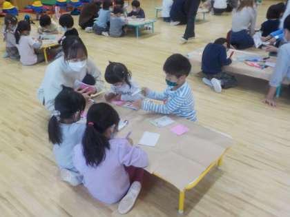今日のなかよしタイムでは,同志社大学の学生さんに来てもらい,「新町祭」に飾る絵をかきました。「新町祭」は同志社大学が地域との交流を深める目的で開催されています。親しみをもって関わっていく子どもたちの思いを,大学生のお兄さんお姉さんが,目線を合わせて温かく受け止めてくれている姿が印象的でした。地域のいろいろな人にかかわってもらいながら育っている,みつば幼稚園の子どもたちです。