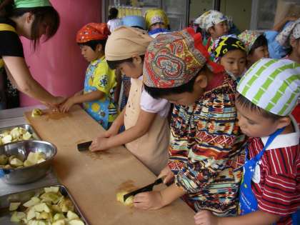 子どもたち全員がかかわって材料の下準備をしました。3歳,4歳の子どもたちもカレーのできるのをとても楽しみに待っていました。