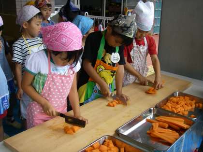 大胆にズバッズバッと切っていく子どももあれば,恐る恐る包丁を入れていく子どもたちもいました。見ている先生やお母さん先生たち大人は,ちょっとドキドキ,ハラハラする場面もありましたが,無事材料を切ることができました。