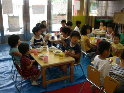 みんなで元気に「いただきま〜す」とあいさつをして食べ始めると,あちこちで「おいしい」という声がきかれました。各机では,話も弾み,楽しく食べていました。