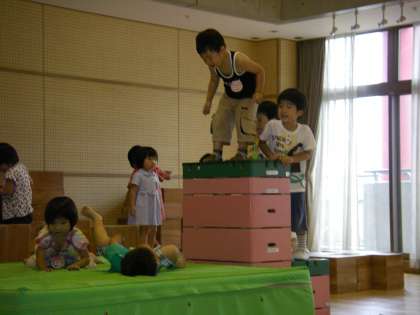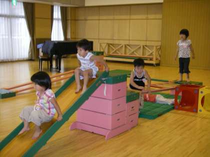 プールにも入れず子どもたちは,遊戯室で巧技台や大積み木などでゆ〜っくりと遊んでいました。たんぽぽ組ともも組の子どもたちが,この頃プールでも一緒に遊んでいるからということもあるのでしょうか自然に混じって遊んでいる姿がありました。
