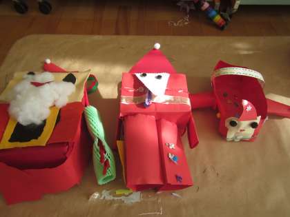 胴体部分にプレゼントを入れられるように,一枚の画用紙からなんとか箱型にしていっています。先生も様々な方法を提示しながら子どもたちが”こうしたい”と思っていることを実現できるように一緒に試行錯誤しながらつくることを楽しんでいます。