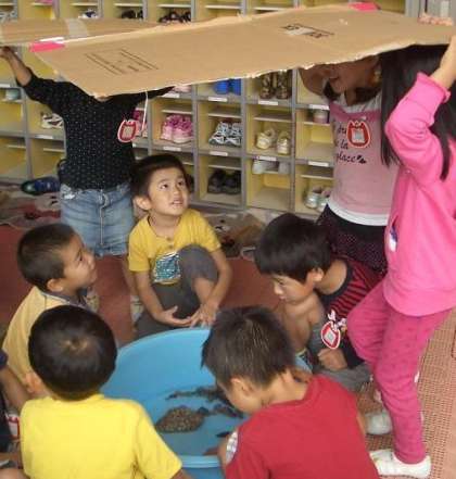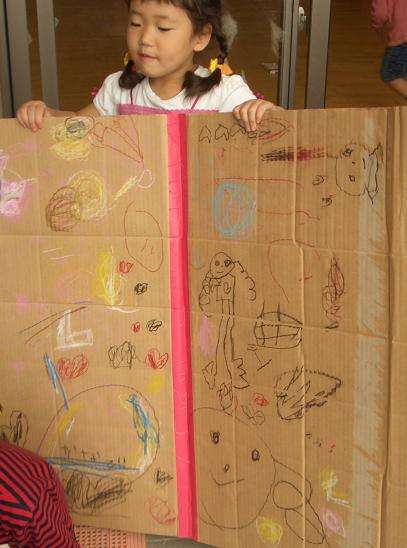 3人の子どもが段ボールを持って見せにきてくれました。