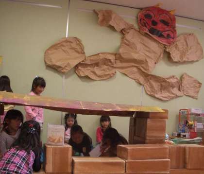 桃太郎のイメージで遊び始めたゆり組には,鬼に興味が広がっています。