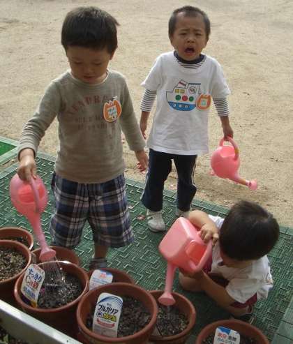 4歳児は菜の花,5歳児はほうれん草などの冬野菜の種を蒔き,生長を楽しみにしています。