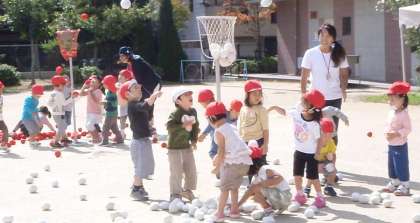 3歳児のたんぽぽ組ともも組が一緒に玉入れを楽しんでいます。