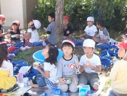 りぼんちゃんを木の根元において,その周りを子どもたちが囲んでお弁当となりました。