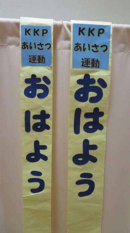 13日から今日まで『KKP(上京中・烏丸中学校区の小学校・幼稚園・保育所のプロジェクトです)あいさつ運動』を実施しました。朝,門に立っている先生が“おはよう”と書いた襷をかけて「おはようございます!」と挨拶すると,襷の文字を一生懸命目で追ったり,恥ずかしそうに「おはようございます」と返したり,声に出して挨拶しようとする姿が出てきました。気持ちの良い挨拶で一日をスタートすると,元気が出ますね。『KKPあいさつ運動』は今日まででしたが,引き続き「おはよう」「ありがとう」「さようなら」…挨拶をする気持ち良さを感じられる生活を大切にしたいと思います。