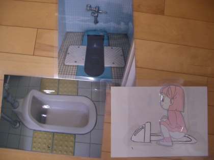 次に保健の先生から公衆,幼稚園の和式や洋式のトイレの写真を見せてもらったり,絵や保健の先生特製の実寸大トイレ模型を使って,どういう風に使ったらいいのかの話を聞きました。