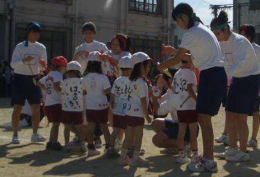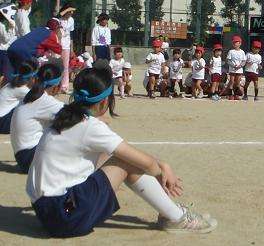 走り終わった子どもは手にポンポンの目印をつけた中学生が子どもたちのテントまで連れて行ってくれました。